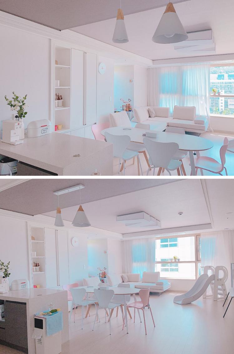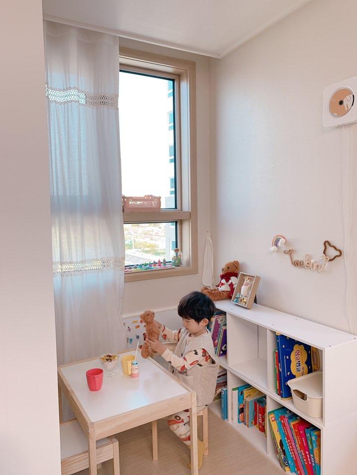 테이블과 아기 책장은 이사 오기 전에 남편과 제가 직접 화이트 페인트 칠로 리폼을 한 건데요. 이전 집에서 색감이 튀는 장이나 테이블이 많아서 이번 집에서는 꼭 화이트 컬러로 가구 리폼을 작게나마 하고 싶었거든요.