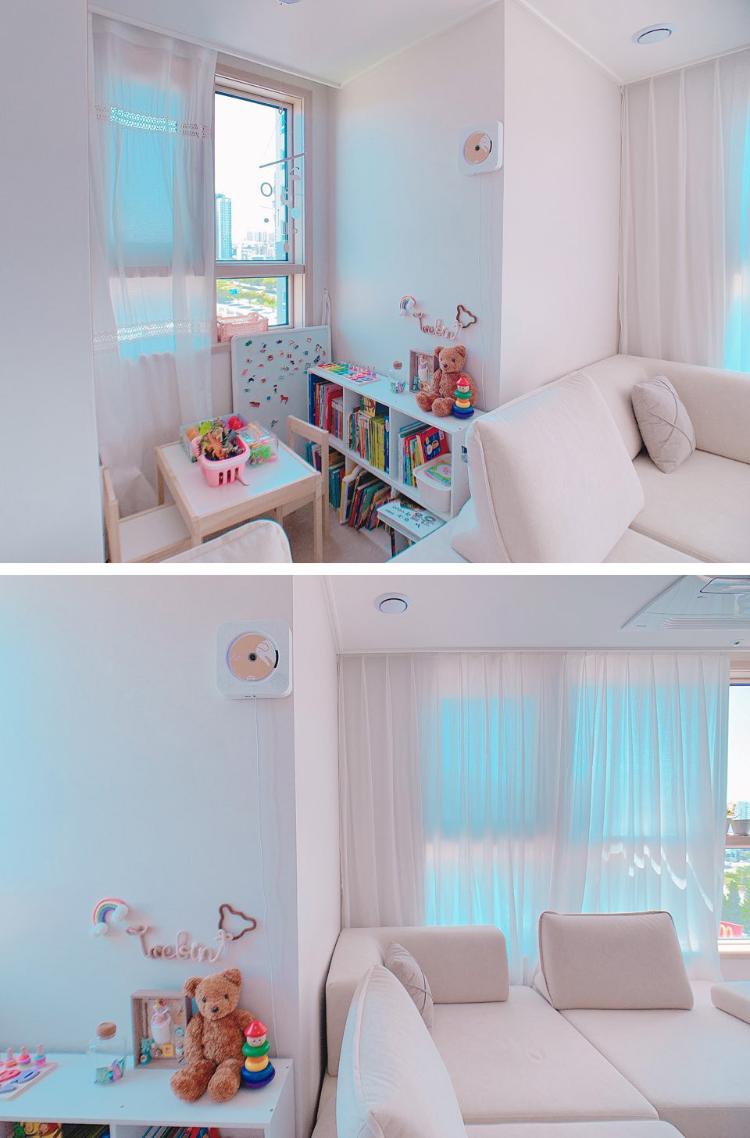 아기의 또 다른 놀이공간이자 책방이에요. 두 살 때 이사를 왔는데 벌써 세 살!! 책을 좀 읽혀야겠다 싶어서 게스트룸 & 아기방에 있던 책장들도 알파룸으로 옮겨오고 선물 받은 모빌과 곰인형 & 탯줄 액자 니트 레터링 등등 아기들 소품들로 꾸며줘봤어요!