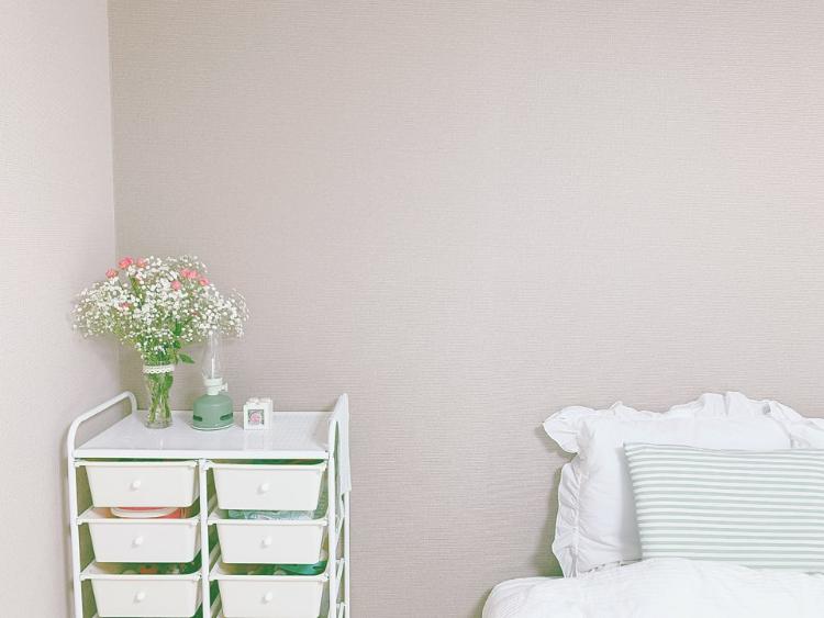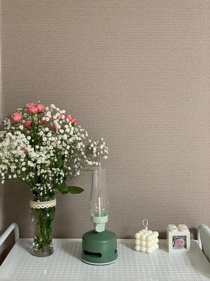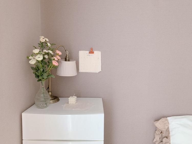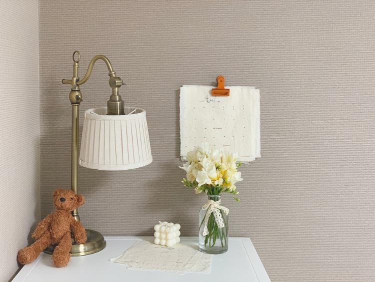 수납장 위가 침대방 문 열면 잘 보이는 공간인지라, 계절이 바뀌면 꽃이나 소품들이 살짝 바뀌는 것 같아요. 램프나 초로 데코 해주기도 하고, 제가 직접 만든 패브릭 달력이나 생화를 꽂아두기도 하고요. 어떤 소품들을 매치하느냐에 따라 침대방 분위기가 달라지는 것 같아요!