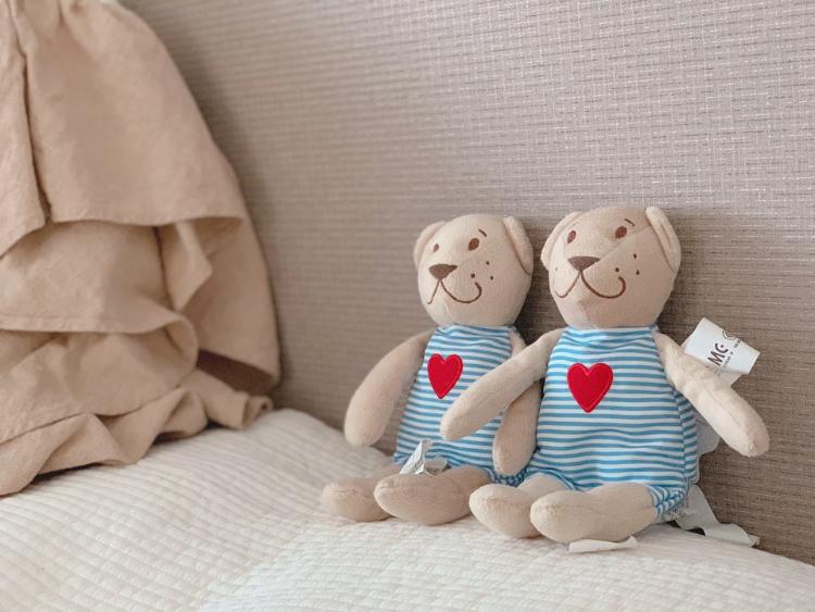 침대방은 정말 침대 옆 수납장과 티비 옆 선반 말고는 정말 침대와 티비만 있는 정도에요. 포근포근하게 세 식구 잠드는 공간인지라, 인형들과 함께 패밀리 침대에서 함께 자구요. 침실방만 벽지가 브라운톤 인지라, 여름침구들도 화이트&브라운컬러로 맞췄어요!