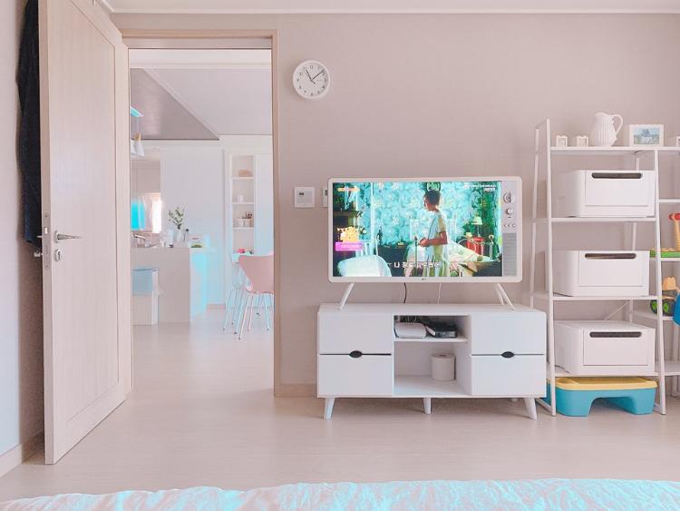 침대에 누워 티비 보는 것을 즐기는 저희 부부입니다. 예전 집에서도 있던 화이트 티비와 선반장을 그대로 옮겨왔구요. 아기가 생기면서 살림살이가 늘어나 선반장을 두고 아기장난감이나 미술용품들을 보관 해 두었답니다.