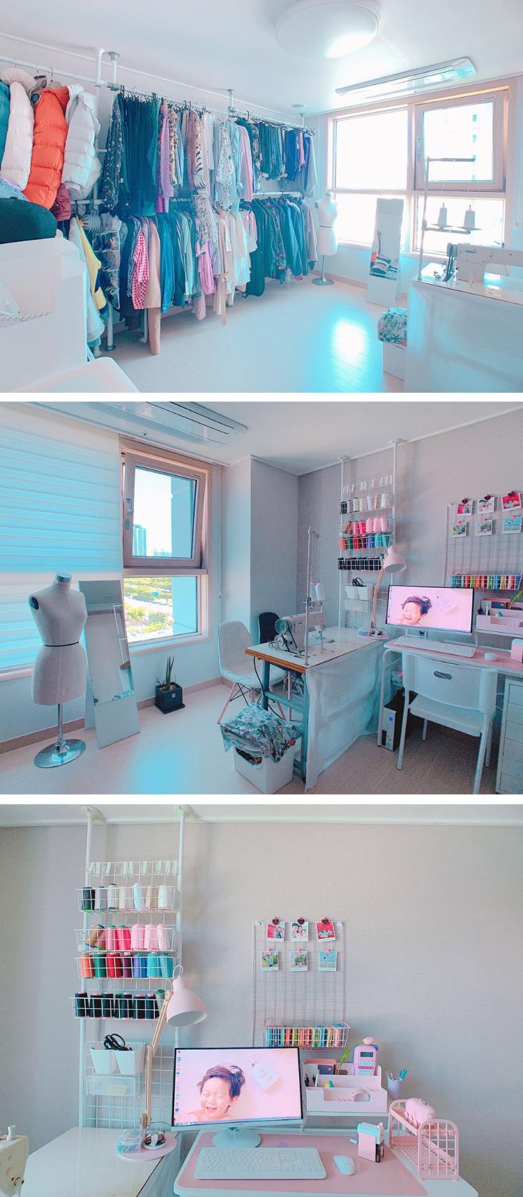 만들고 나서, 사진 편집이나 블로깅을 할 때에는 컴퓨터를 써야 해서, 예전에는 컴퓨터가 알파룸에 있었는데 함께 있어야 편할 것 같아서 위치를 옮겼어요! 덕분에 노래도 들으면서 재봉질도 하는 중이랍니다~