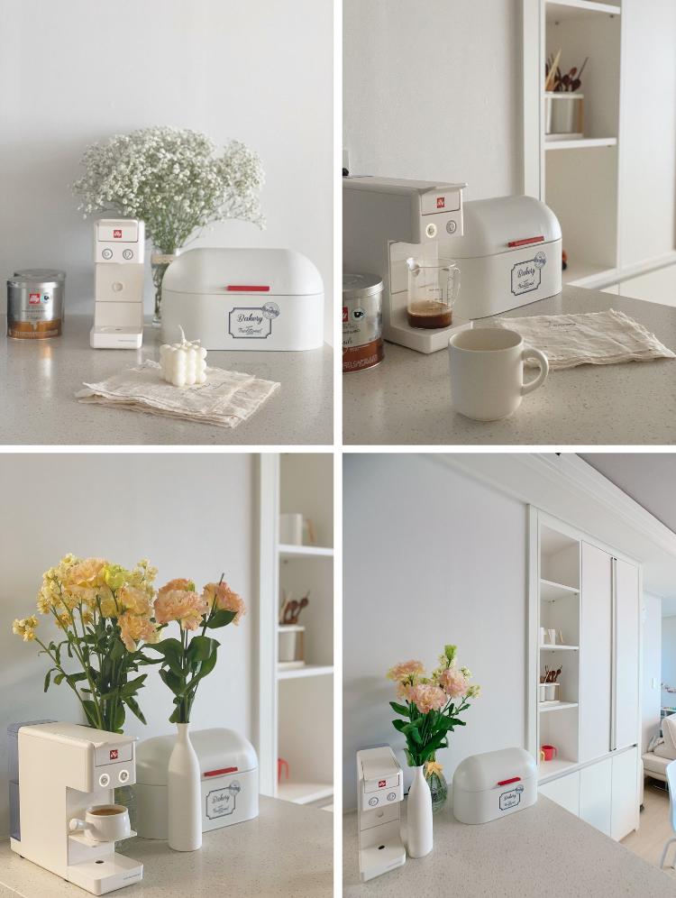 제가 가장 오래 머물러 있는 공간이 바로 주방과 식탁인 것 같아요. 동생이 이사 선물로 사다 준 커피 머신 덕분에, 저의 화이트 주방이 완성되었다고 해도 과언이 아닌 것 같아요.