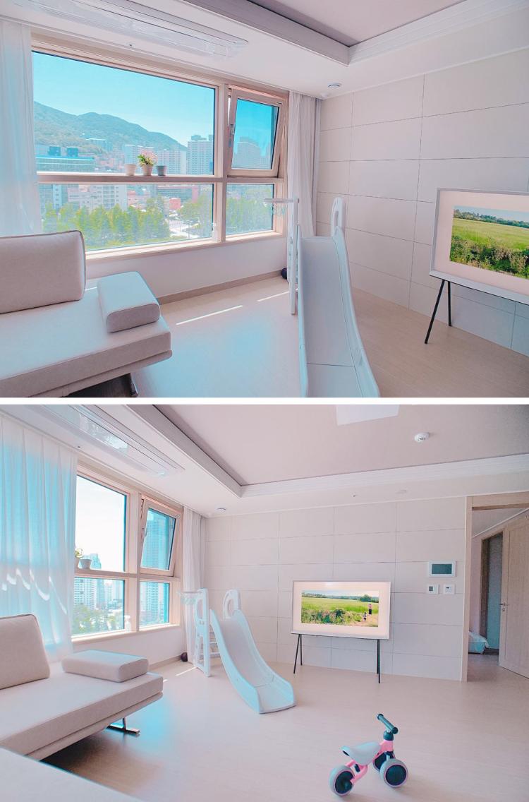 남향의 햇살을 가득 담아 소파에서 커피도 마시고 티비도 보는데요. 아무래도 아기집인지라, 미끄럼틀이나 자전거 등 아기소품이 많이 보여요.