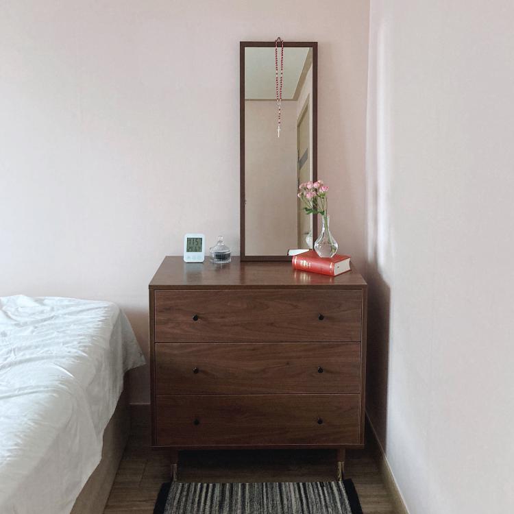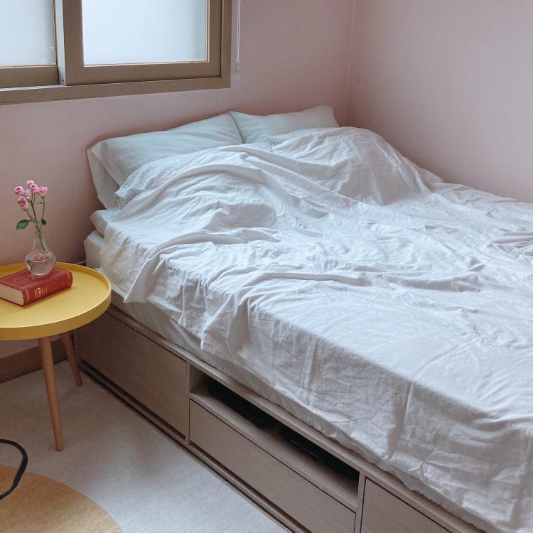 저희 침대를 놓고 남는 공간 한 쪽에는 3단 서랍장을 배치했어요. 여기는 아기 옷, 가제손수건, 기타 육아에 필요한 제품들을 수납해둬서 필요한 상황에 맞춰 꺼내 사용할 예정이에요.