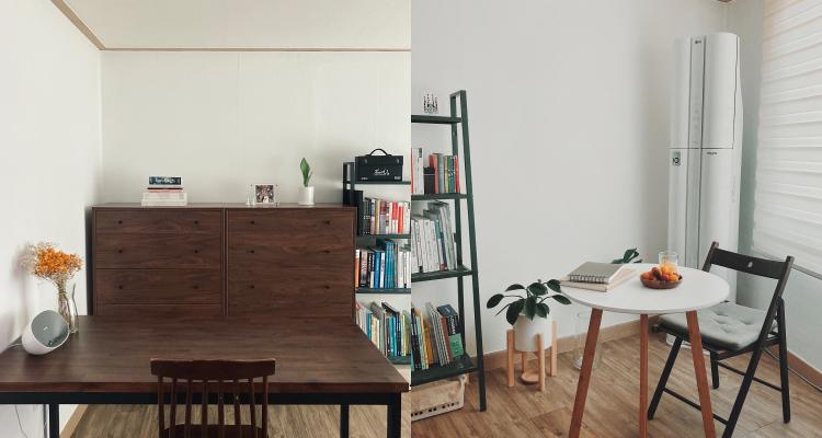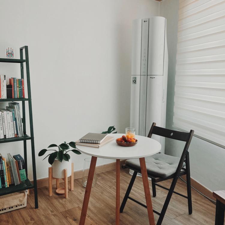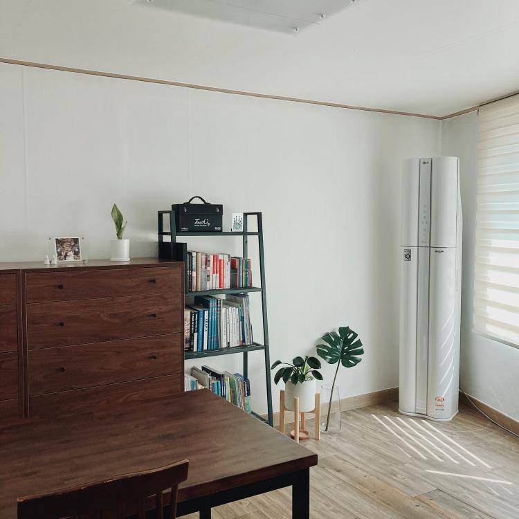 그래서 대각선 벽면 구석에 에어컨을 두었고, 거실에서 보내는 시간이 많기 때문에 책을 읽기 쉽게 작은방에 있던 책꽂이를 거실로 옮겼어요.
