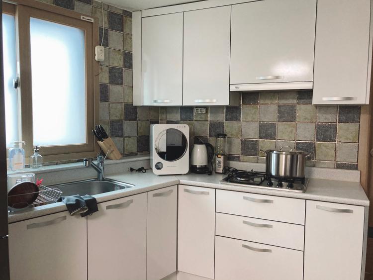 부엌은 거실과 바로 연결되어 있어요. 부엌 역시 창문 있는 쪽이 대각선의 좁은 구조라서 조리에 필요한 전자제품을 두기엔 공간이 협소해요. 그래서 출산 후 필요한 젖병 소독기, 분유 포트, 자주 사용하는 믹서기. 이렇게 3가지 제품만 꺼내두고 나머지 주방용품들은 찬장이나 하 부장에 수납해 최대한 깔끔하게 사용하려 노력 중이에요.