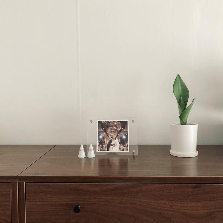 서랍장 위에는 결혼식 때 찍은 사진을 따로 인화해서 액자에 넣어두고 남편에게 선물 받은 문샤인 화분으로 인테리어 데코 효과를 주었어요.