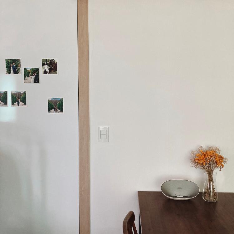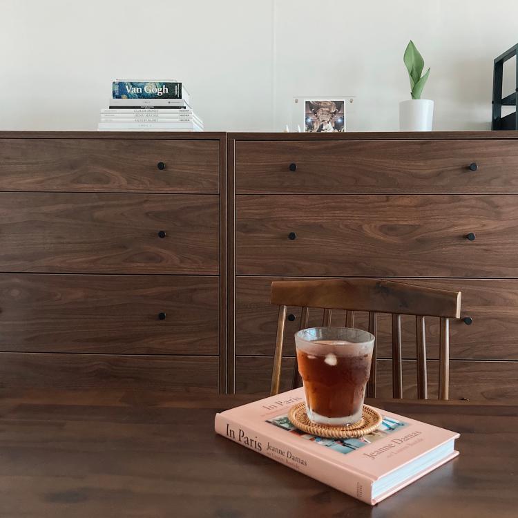 지금 보이는 가구들은 신혼 때 구매한 가구를 그대로 가져왔어요. 서랍장, 테이블, 의자는 까사미아까사온 제품으로 구매 당시 같은 라인의 제품으로 구매해 통일감을 주려고 했고, 아직까지 만족스럽게 사용 중이에요.