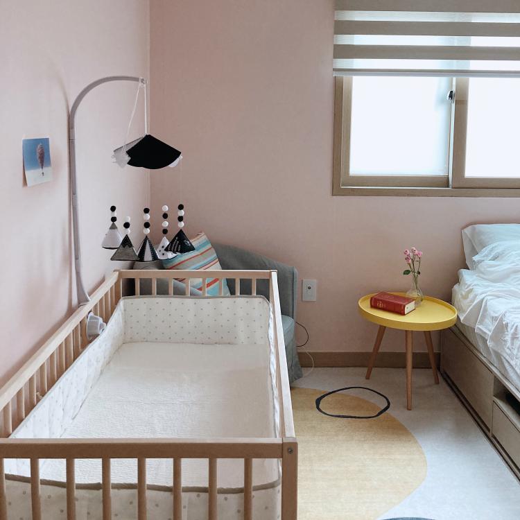 한쪽에는 아기 침대가 있고 바로 맞은편에는 저희가 사용할 침대를 배치해둬서 서로 마주 보게끔 구조를 잡았어요.