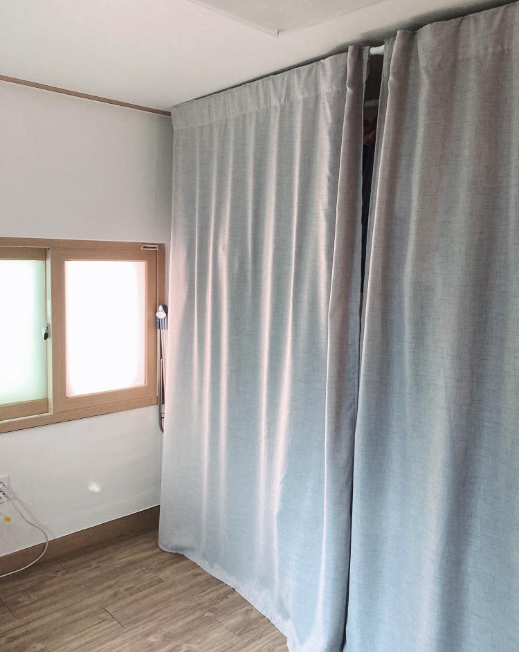 마지막으로 소개해드릴 곳은 드레스룸 겸 작업실인 작은방이에요. 한 쪽 벽면 전체는 옷을 걸 수 있는 행거를 설치했는데 커튼이 있는 행거로 처음부터 구매했어요. 옷이 보이는 지저분함과 옷에 먼지가 붙는 걸 방지하기 위한 선택이었어요.