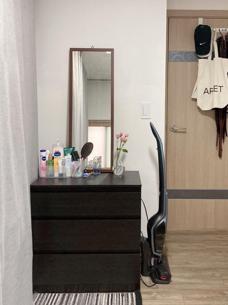 행거를 설치하고 남는 공간에는 작은 3단 서랍장을 둬서 화장대 겸 수납장으로 사용중이에요. 그리고 모자나 벨트, 에코백 같은 종류는 문걸이 행거를 통해 걸어두고 그때그때 필요할 때 사용하고 있어요.