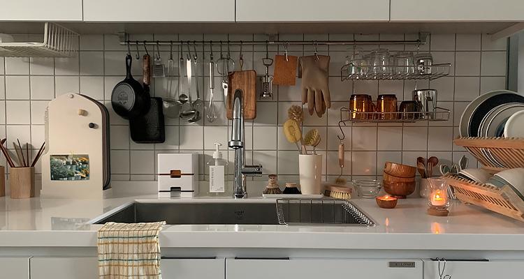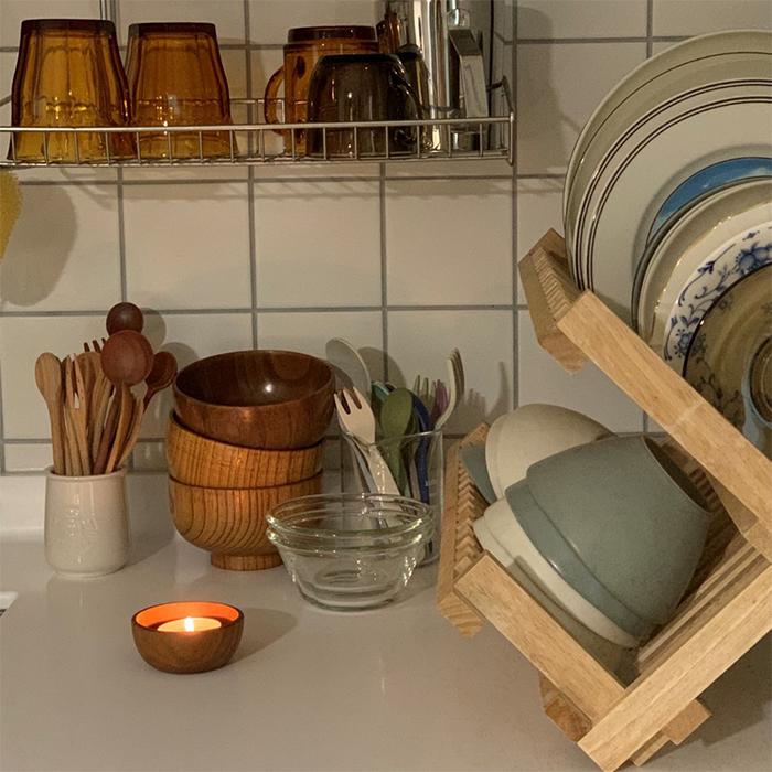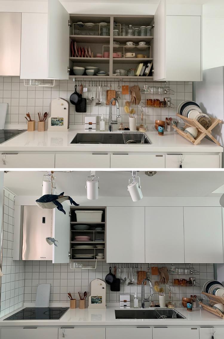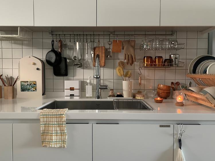 싱크대를 하면서 상부장을 없앨까도 고민을 많이 해 봤는데, 집이 작고 수납공간이 없다보니 그건 안 될 거 같더라고요. 게다가 야금야금 사들인 그릇도 생각보다 양이 많아 상부장이 있어도 가득 차니 상부장 없는 주방은 꿈도 못 꾸겠어요.