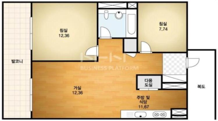 지은지 20년이 넘은 아파트라 옛날 평면도와 구조가 조금 다른데, 기존의 다용도실(세탁실)을 철거하고 베란다에 세탁기를 넣는 구조랍니다.