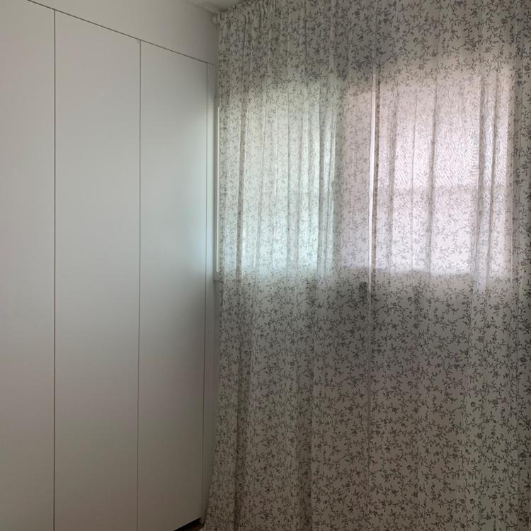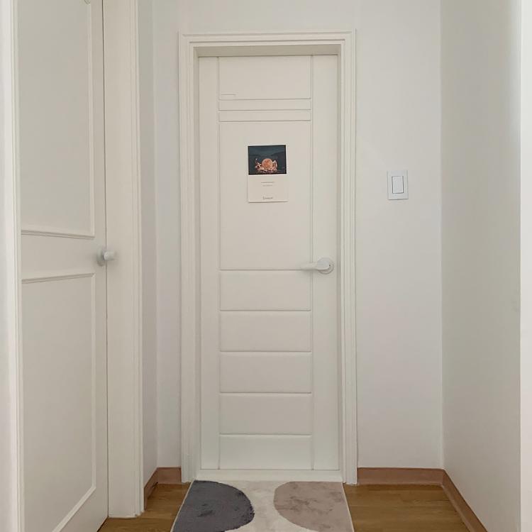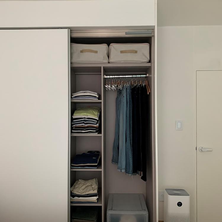작은방처럼 침실에도 붙박이장을 두었는데, 저희 집 침대가 큰 편이라 여닫이를 할 수 없었어요. 여닫이가 예뻐서 다 여닫이로 하려고 했는데 공간이 나오지 않아 어쩔 수 없이 미닫이로 했죠. 무리해서라도 여닫이로 할까 하다가 미닫이를 했는데, 잘한 선택인 거 같아요.