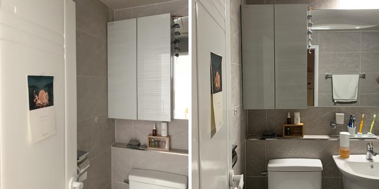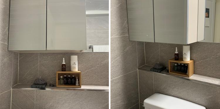 변기와 세면대 대각선 뒤로는 선반을 설치했어요. 물건을 쭉 늘어트려 놓는 게 싫어서 선반을 샀어요. 깔끔하게 정리가 된 거 같아요.