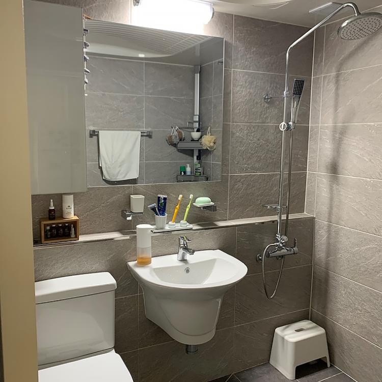 화장실은 이미 리모델링이 되어 있는 상태였고 손을 대기에는 아까운 상태였기에 소품을 이용해 꾸며주었어요. 타일 재질이 스톤 느낌이었기 때문에 컨셉을 제주로 잡아봤어요.