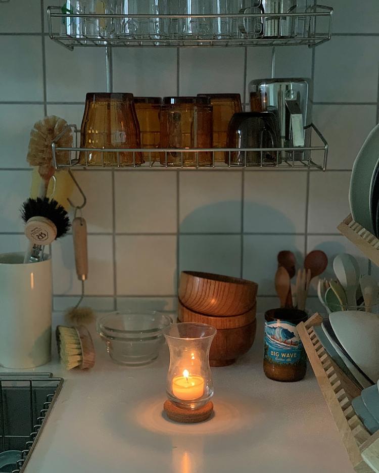 저는 초를 켜 놓는 걸 좋아해요. 예전엔 분위기가 예뻐서 좋았는데, 요즘은 은은하게 퍼지는 향이 마음에 들어요. 또 이렇게 작은 초는 한 번에 태우기 편리해서 매번 향을 바꿔줄 수 있는 점도 좋아요. 이건 비 오는 날 낮 시간의 사진인데, 우중충한 기분을 분위기 있게 바꿔줄 수 있는 거 같아요.