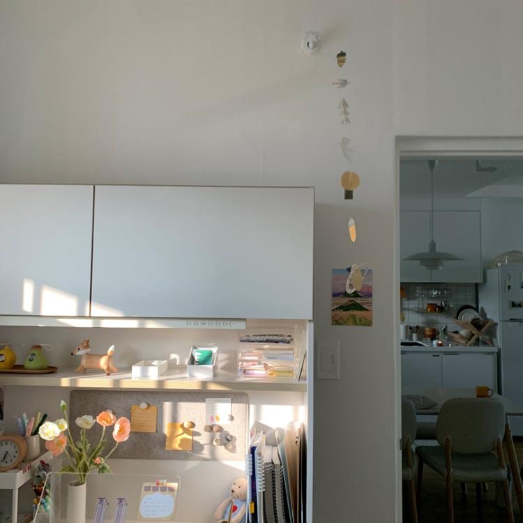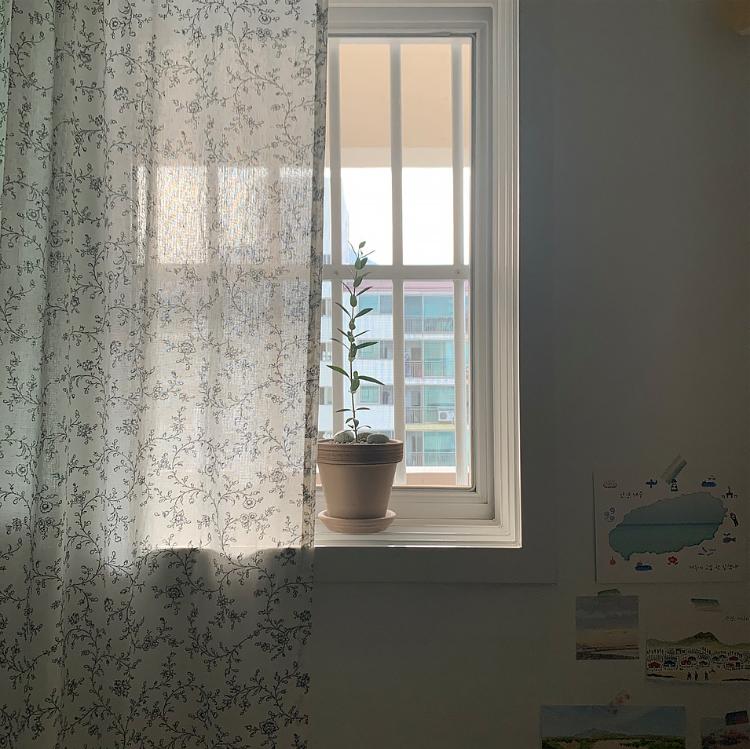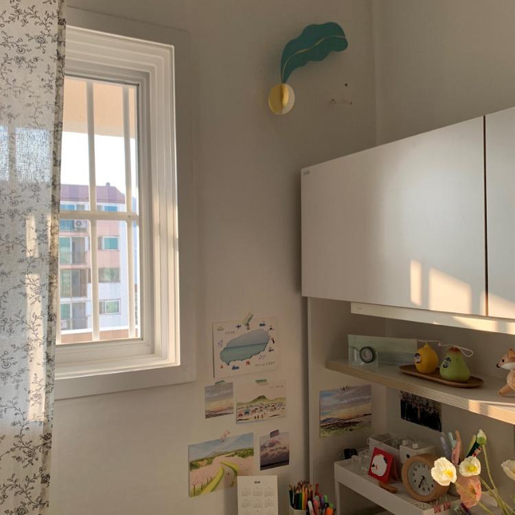 복도식 아파트다 보니 커튼은 꼭 필요한 거 같아요. 책상 쪽에 빛도 많이 들어오고 하니 더더욱 필요한 커튼! 커튼을 치면 이렇게 햇살이 은은하게 들어온답니다.