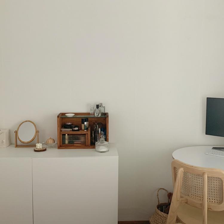 침실 방도 원목과 화이트로 공간을 채웠어요. 화이트 수납장에 원목 제품들 놓고,