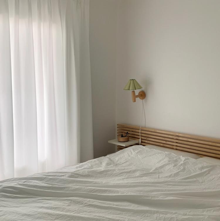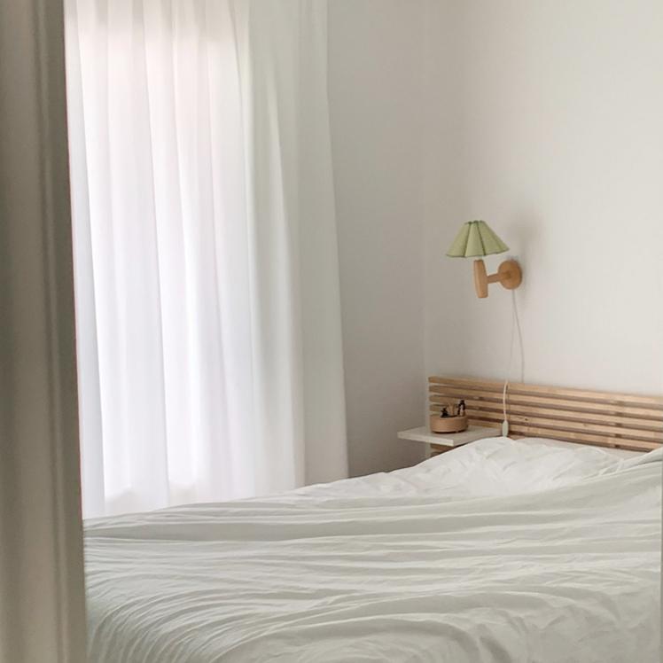 저희 집에서 가장 큰 가구인 침대. 이사 올 때도 침대가 들어오기 힘들어 애먹었답니다. 원목 헤드와 벽 조명이 이 방의 포인트예요.
