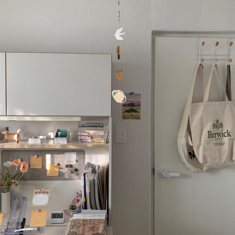 방문을 닫으면 가방걸이가 있어요. 자주 사용하는 가방은 여기 걸어서 두고 나머지는 붙박이장에 넣어 보관해요.