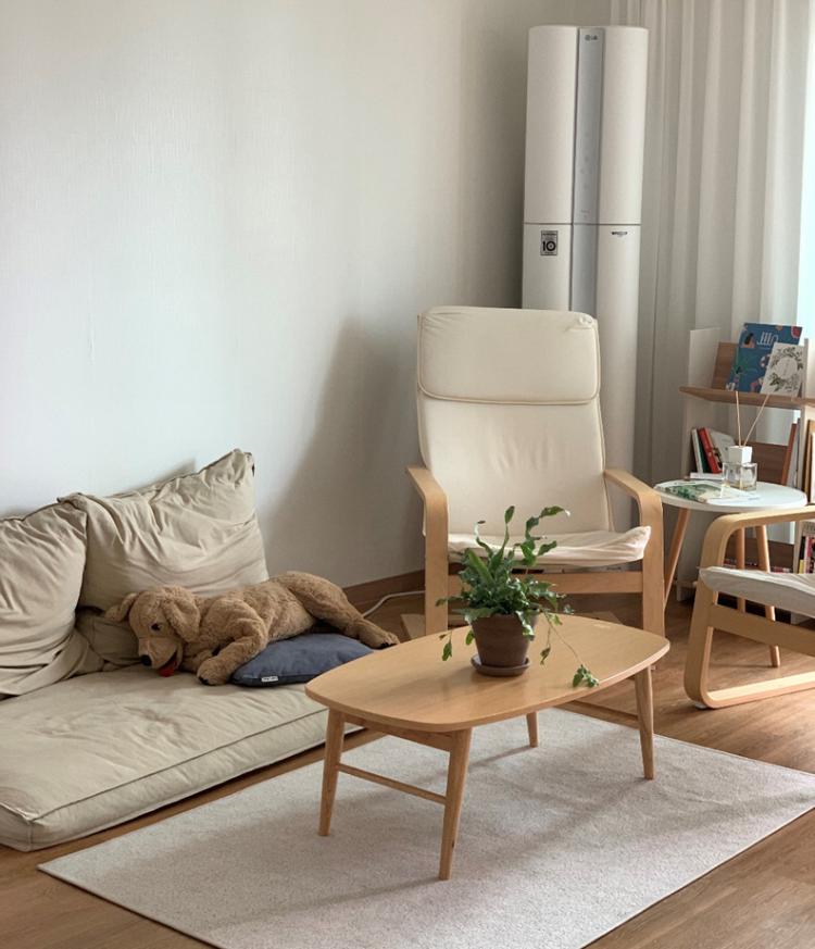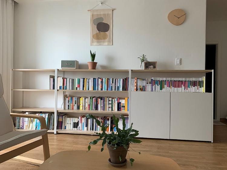 다음으로 소개할 곳은 거실이에요. 보통 거실이라고 하면, 쇼파와 티비가 있는 공간을 떠올리는 거 같아요. 요즘은 티비 없는 집도 점차 많아지고 있는 추세지만, 친구들이 놀러올 때면 티비가 없네? 하고 놀라더라고요. 저희는 티비 대신 책장을 두었어요.