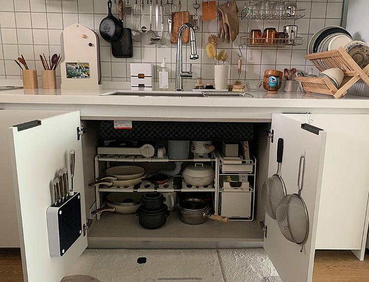 상부장 정리보다 어려운 게 하부장 정리인 거 같아요. 상부장은 깊이가 깊지 않은데 하부는 깊이가 깊어서 공간은 있지만 사용하기가 어려워요. 매일 새로운 아이디어가 날 때마다 이렇게 해볼까 저렇게 해볼까 하면서 요리조리 바꾸고 있답니다. 그래도 고정적인 건 냄비와 후라이팬을 보관하는 이 하부장인 거 같아요.