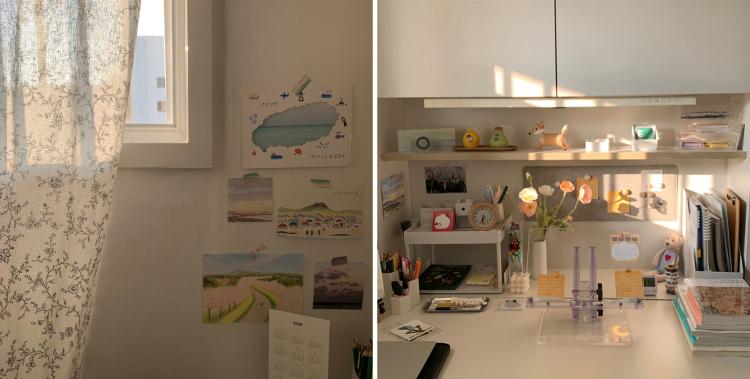 저는 엽서랑 문구용품을 사는 걸 좋아하는데요. 하나씩 모은 엽서들을 가지런히 붙여두면 여행지에서의 추억도 떠오르고 공부할 때도 행복한 기분이 들어요.