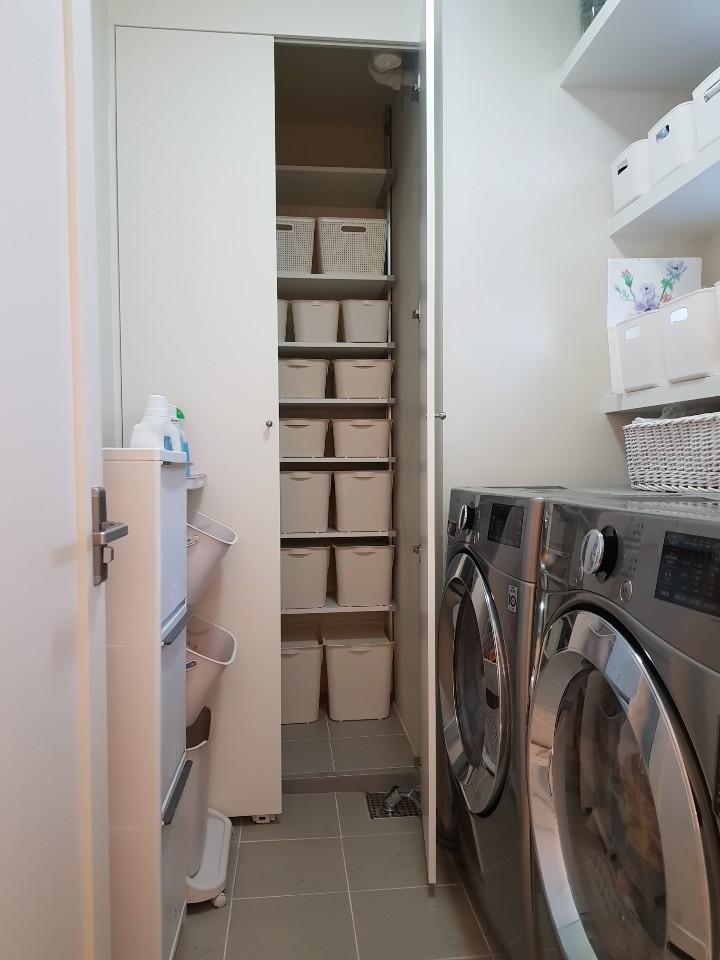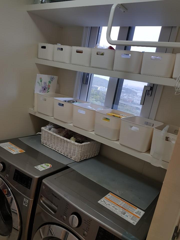 미국에서 넓은 다용도실에서 일렬인 세탁기&건조기 사용하다 직렬로 사용하니 불편하기도 해서, 손빨래하지 않는 나에겐 굳이 필요 없는 보조 싱크대가 있던 기존의 보조주방을 과감히 없애고, 세탁기&건조기를 일렬로 놓으니 건조해서 빨랫감을 바로 개고, 분류하니 너무 편하고, 세탁기&건조기 있던 자리엔 팬트리를 다시 짜서 수납을 해서 넣었더니 깔끔해졌어요.