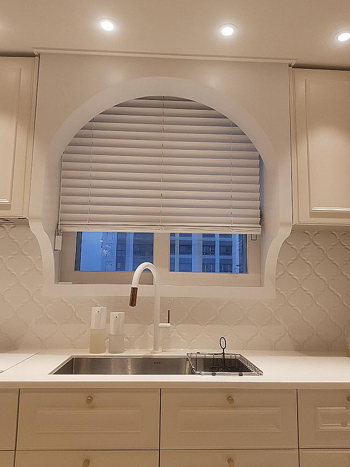 주부라면 머무르는 시간이 많은 싱크대 개수대는 아치 천장과 블라인드로 창밖을 보면서 즐겁게 서 있을 수 있어요.