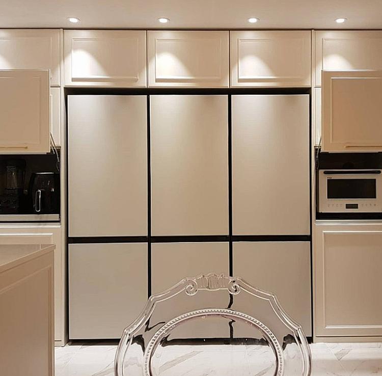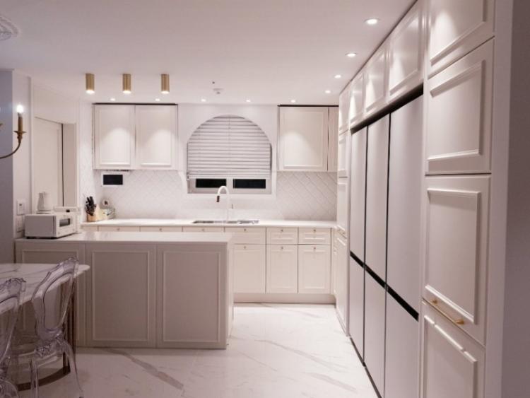 화이트한 주방의 냉장고장은 슬라이딩과 함께 리프트업도어를 만들어서 편리하게 만들고 수납장으로 꽉꽉 채웠어요.