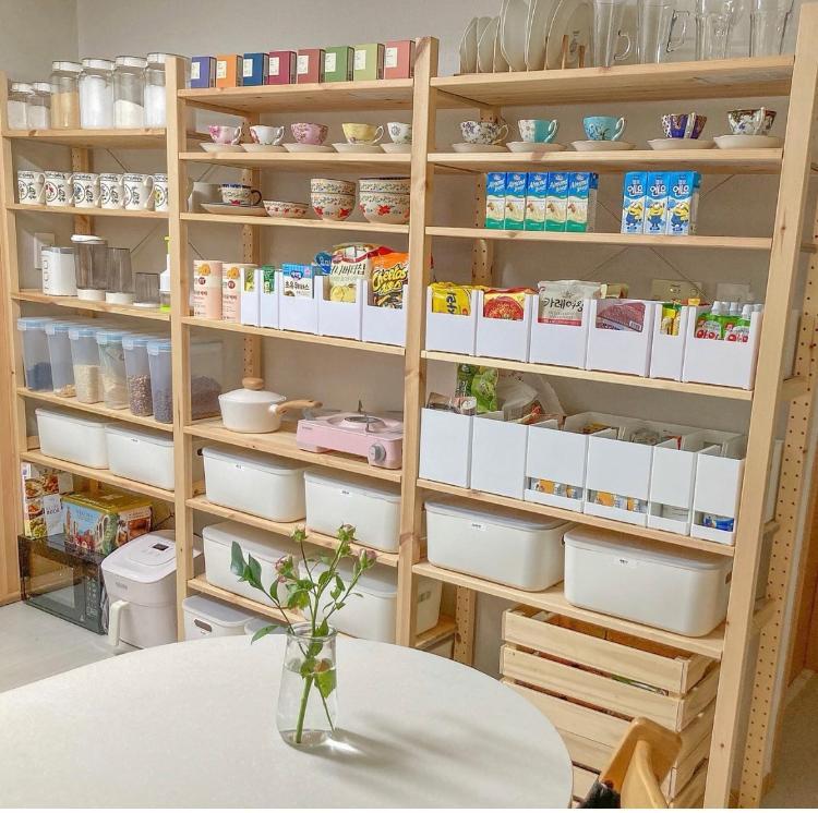 노출되어 있는 팬트리의 경우, 동일한 수납함&정리함으로 정리해주는 게 팁인데요. 각기 다른 상품들이더라도, 수납함으로 통일된 느낌을 줄 수 있어 깔끔해 보인답니다 :)