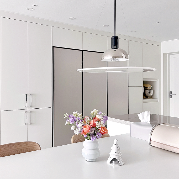 주방 식탁을 가로로 놓았을 때와 세로로 놓았을 때 분위기가 확 다르죠. 테이블 위에는 생화로 꽃꽂이를 해 올려두어 집 안 분위기를 화사하게 만들어 주고 있어요.