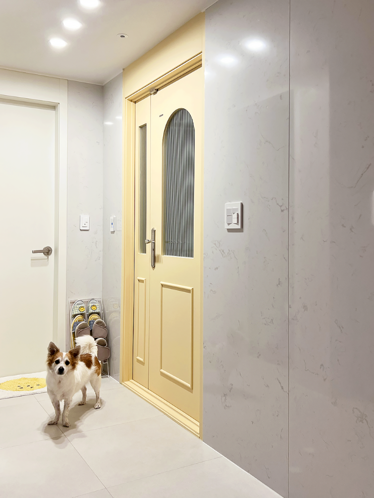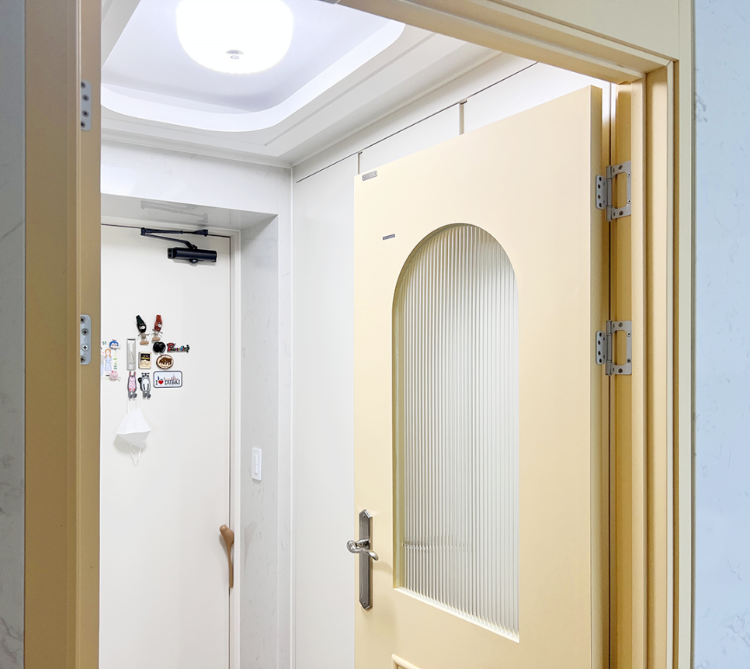 그리고 현관이에요. 현관 중문은 버터옐로우 컬러로 포인트를 줬어요. 집에 딱 들어왔을 때 모두가 화사하고 상큼하다고 해줘서 만족스러운 중문이에요. 현관쪽에도 간접등을 설치했고요.