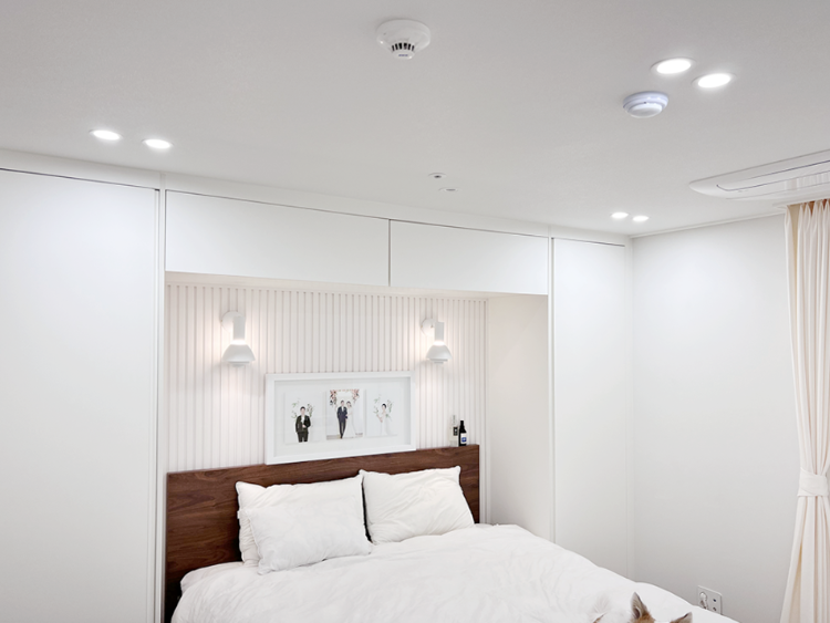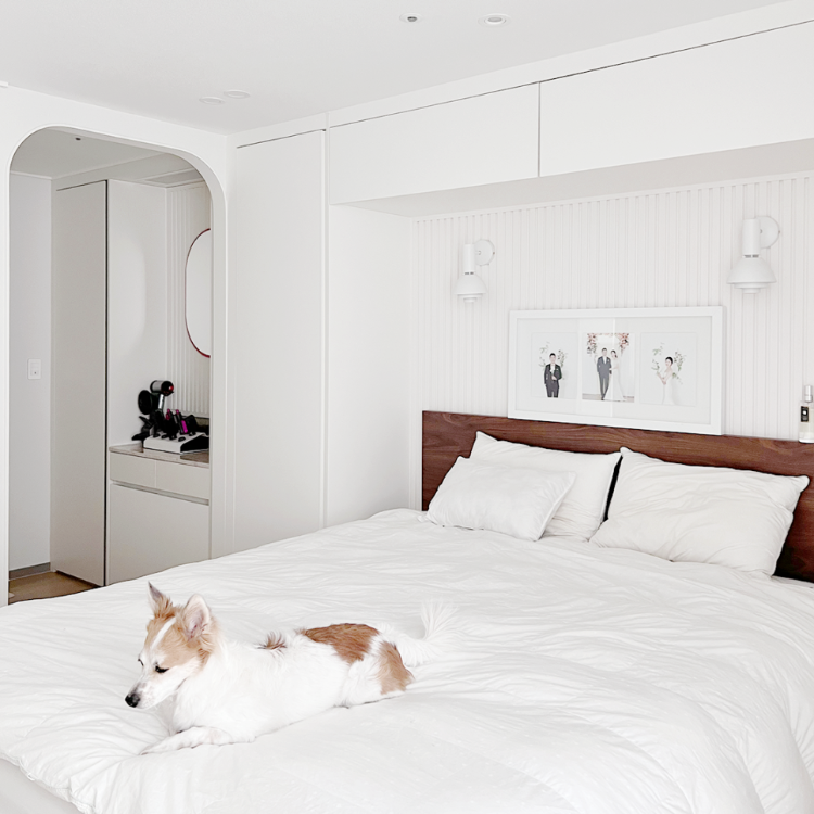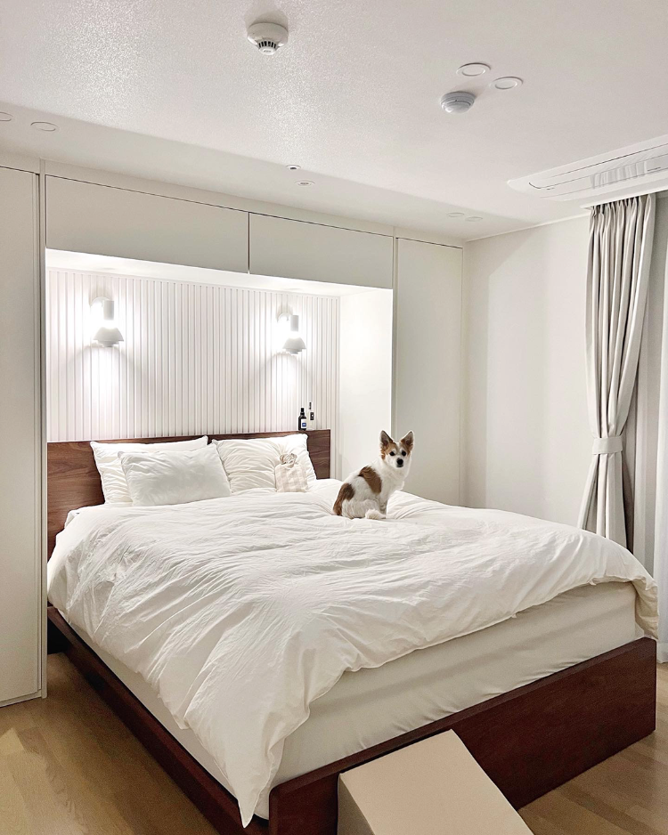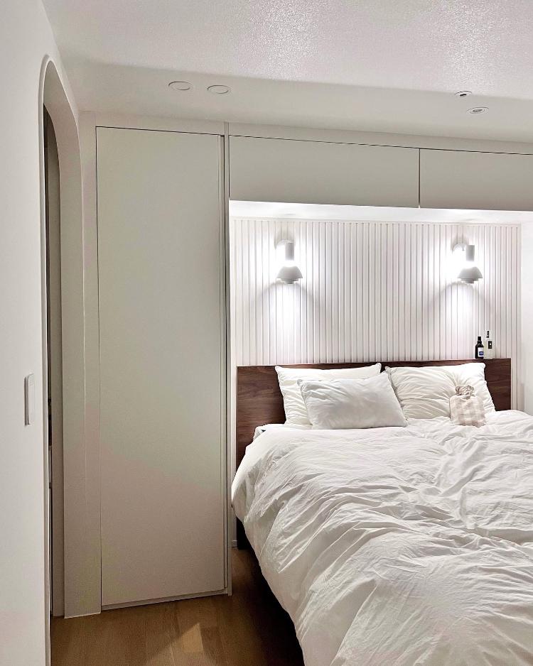 다음은 안방이에요. 안방은 템파보드와 침대장이 포인트인데요. 기존 집에서도 수납과 아늑함을 위해 시공했던 침대장이 정말 만족스러웠어서 이번 집에도 동일하게 침대장을 시공했어요. 시공하면서 침대 프레임쪽 벽면에는 템파보드와 벽등을 시공했답니다.
