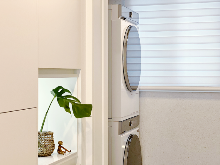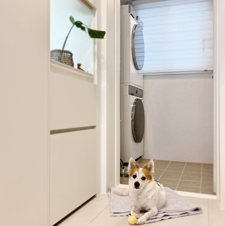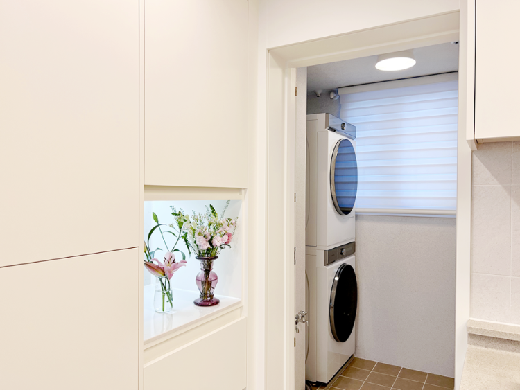 그리고 주방 끝쪽 옆에 있는 문을 열면 이렇게 작은 세탁실이 있어요. 직렬로 세탁기와 건조기를 설치해 두었어요.