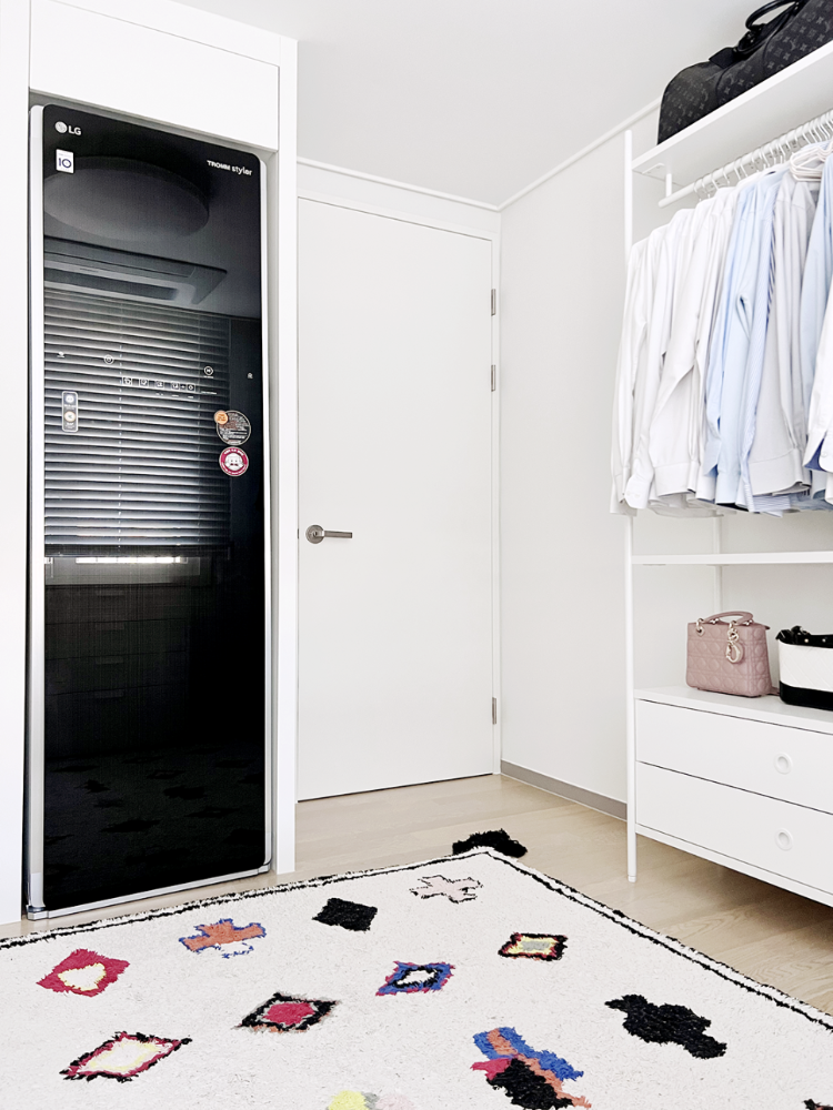 남편이랑 연애때 제가 선물해줬던 스타일러는 사이즈도 크고 디자인도 투박하지만 잘 사용하고 있어요. 성능은 정말 좋거든요. 그냥 보이게 놓는 것보다 ㄱ자 붙박이장 안쪽에 놓아두는 것이 깔끔해보일 것 같아 이렇게 사이즈를 맞춰 붙박이장으로 넣어두었답니다.