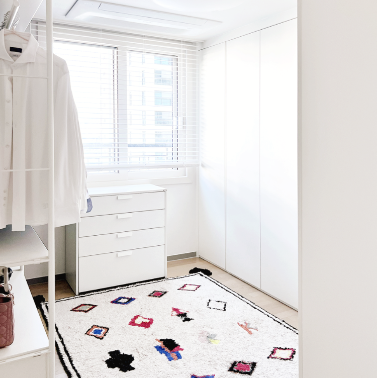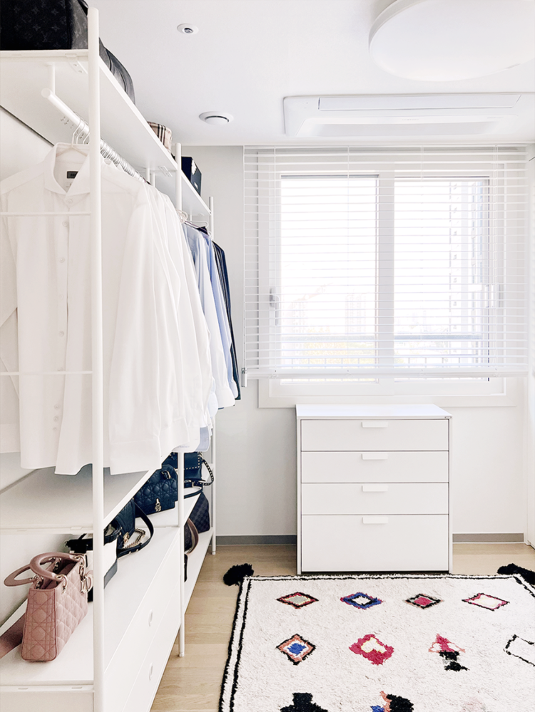 창문에는 화이트 우드 블라인드를 설치했답니다. 그리고 창문 밑으로는 사이즈에 맞는 서랍장을 놓아두었어요. 옷까지 다 들어온 저희집 드레스룸 모습이에요.