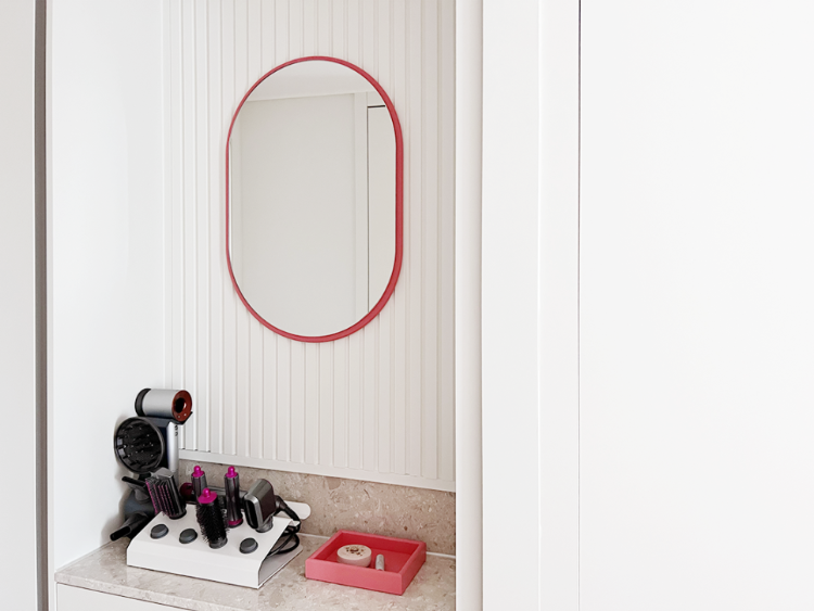 그리고 옆쪽으로 이어지는 화장대에도 같은 템파보드로 연결감을 주었어요. 화장대에는 다이슨 드라이기와 에어랩을 거치대에 정돈해 사용 중이에요. 화장대 위에 화장품들이 나와있는 것을 선호하지 않아서 모두다 수납장에 두고 사용 중이랍니다.