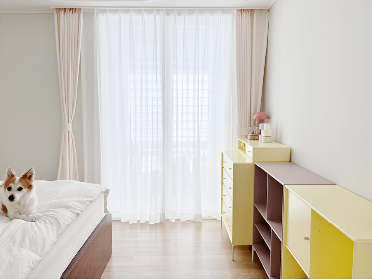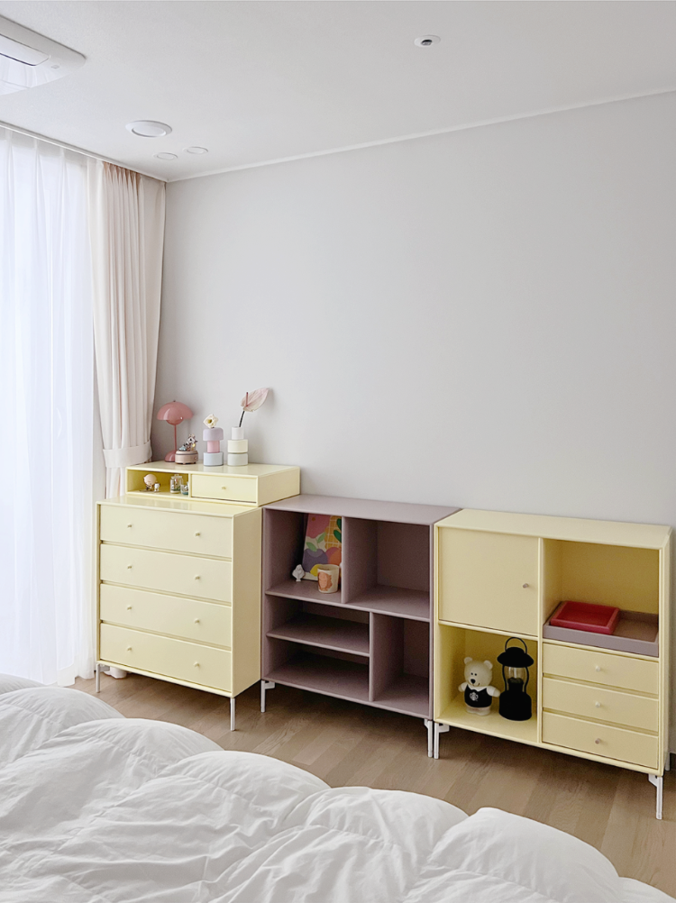 그리고 컬러포인트를 사랑하는 제가 안방에 준 포인트는 바로 서랍장이에요. 몬타나 가구에서 가장 좋아하는 컬러인 레몬색, 카모마일 컬러의 서랍장. 이 서랍장만으로도 분위기가 확 화사해진 것 같아요.