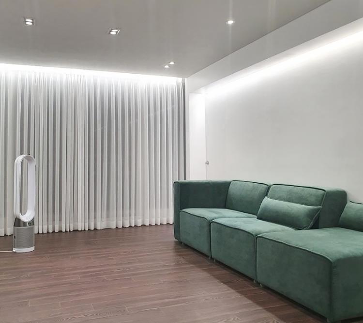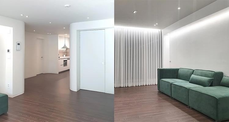 전체적으로 천장과 벽은 웜 화이트로 가볍게, 그리고 바닥은 다크 브라운 컬러의 마루로 무겁게, 시각적으로 천고를 길게 느끼도록 시공했어요. 쓸데없는 몰딩이나 장식은 모두 철거하고 마이너스 몰딩으로 시공해서, 더 깔끔하고 세련된 느낌을 주었고요.