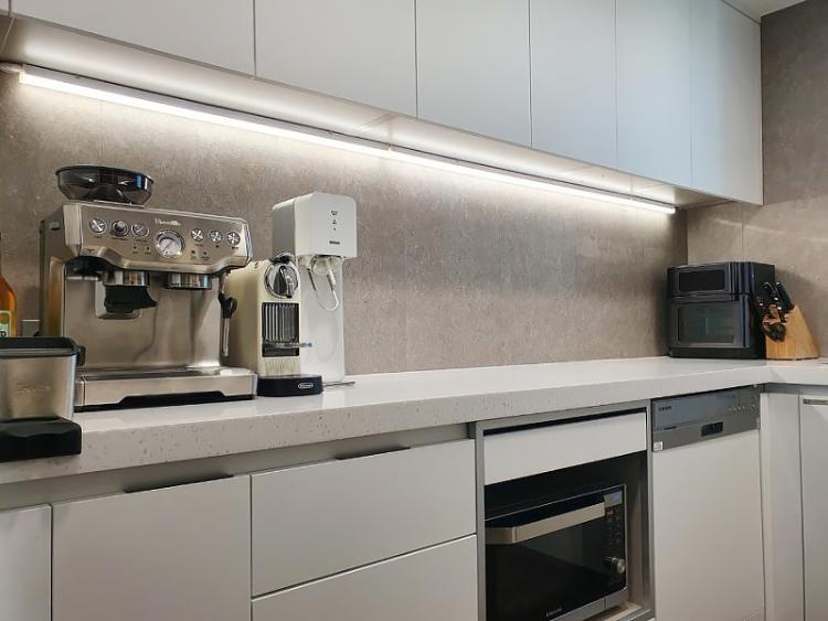 음식을 준비할 때 넓은 조리대가 필요해서 직선으로 처리하고, 부분 조명으로 물건이나 음식이 더 잘 보일 수 있도록 했어요.