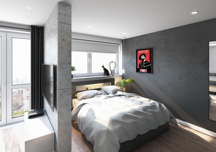 콘크리트 벽 뒤로는 침실 공간이 있는데요. 그레이 컬러의 침대와 짙은 그레이 벽지로 시크한 느낌만 가득하죠~ 오른쪽 옆에는 공간을 밝혀주는 포근한 느낌의 포인트 조명이 아늑한 분위기를 내고 있어요. 화려한 침실보다 간소하고 소박한 분위기의 침실을 좋아합니다:)