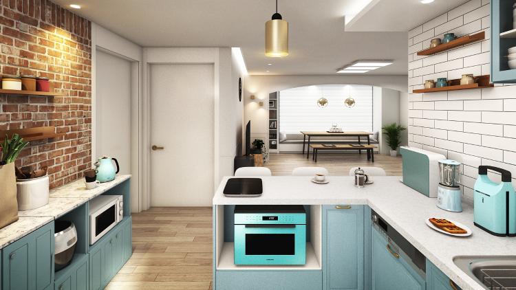 주방 벽면 전체에 비슷한 톤의 수납장을 두어 가전과 각종 식기를 보관해 수납공간을 확보했어요. 싱크대 쪽과 달리 어두운 벽면이라 포인트 조명을 설치했어요. 넉넉한 수납공간과 위로 가전을 놓기에 적당한 선반이 있어 티 세트를 벽면 쪽에 진열해 미니 홈 카페를 연출했어요.
