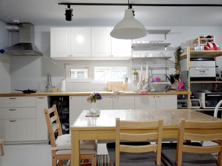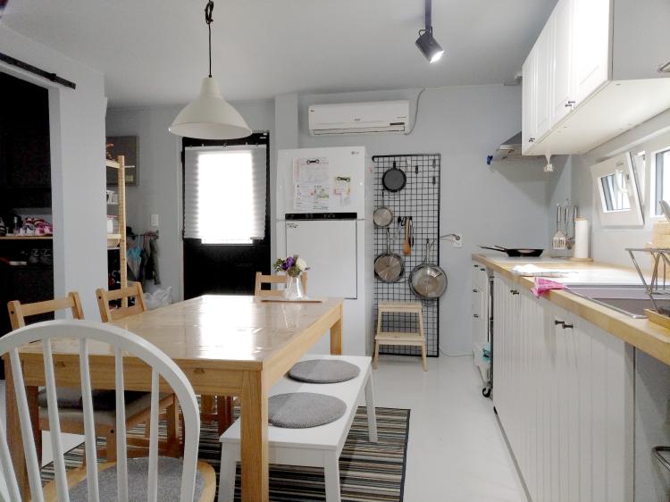 1층 주방은 편안한 신발(보통 슬리퍼)을 신고 생활 합니다. 외국처럼요. 역시 바닥에 보일러를 깔지 않았기 때문에 바닥에 앉는 일은 없죠. 주방에 큰 식탁을 놓아서 가족끼리 매일 저녁 같이 식사를 합니다.