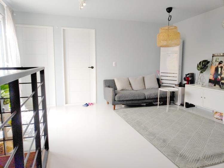 깔끔한 화이트톤의 거실입니다. 남편의 깔끔한 성격과 저의 미니멀 인테리어 로망이 만난 공간입니다. 최대한 깔끔하고 차분한 느낌으로 꾸몄어요. 저희 집은 바닥에 보일러를 깔지 않아서 바닥엔 러그를 깔았고, 냉난방기로 여름과 겨울을 나고 있습니다.
