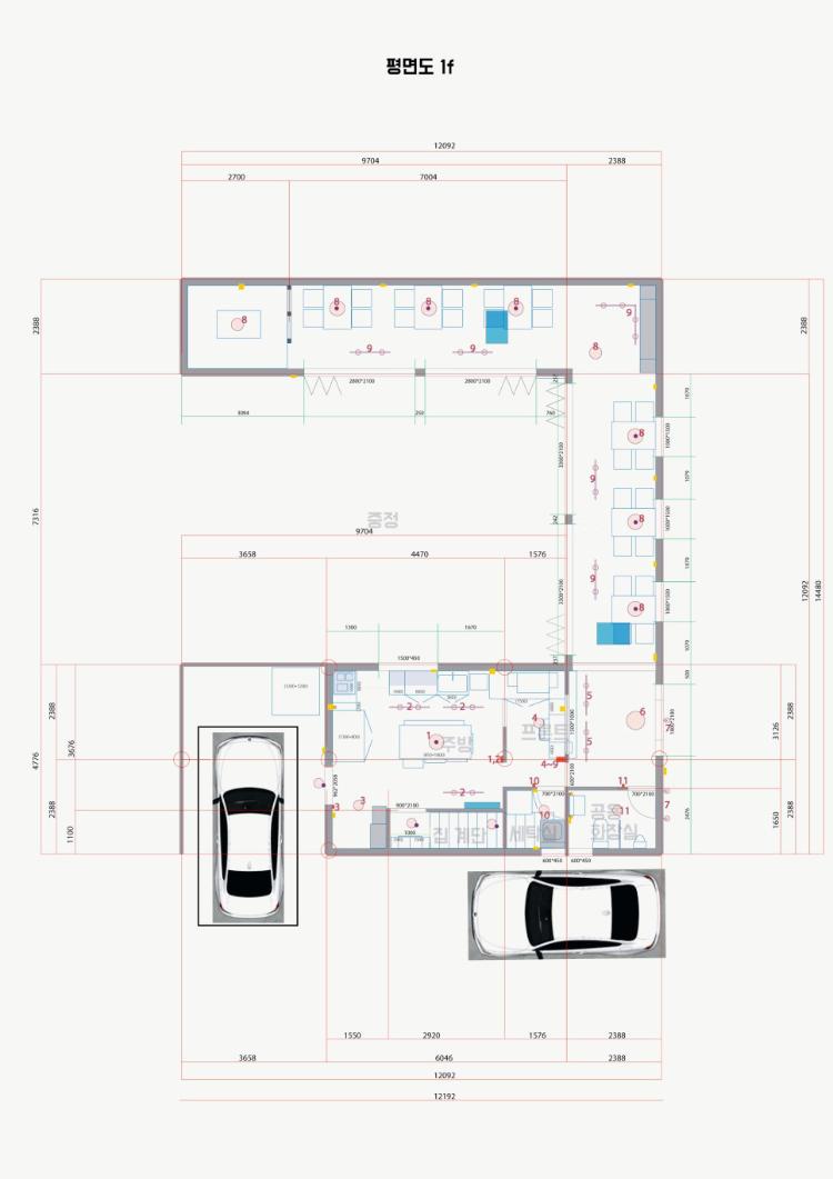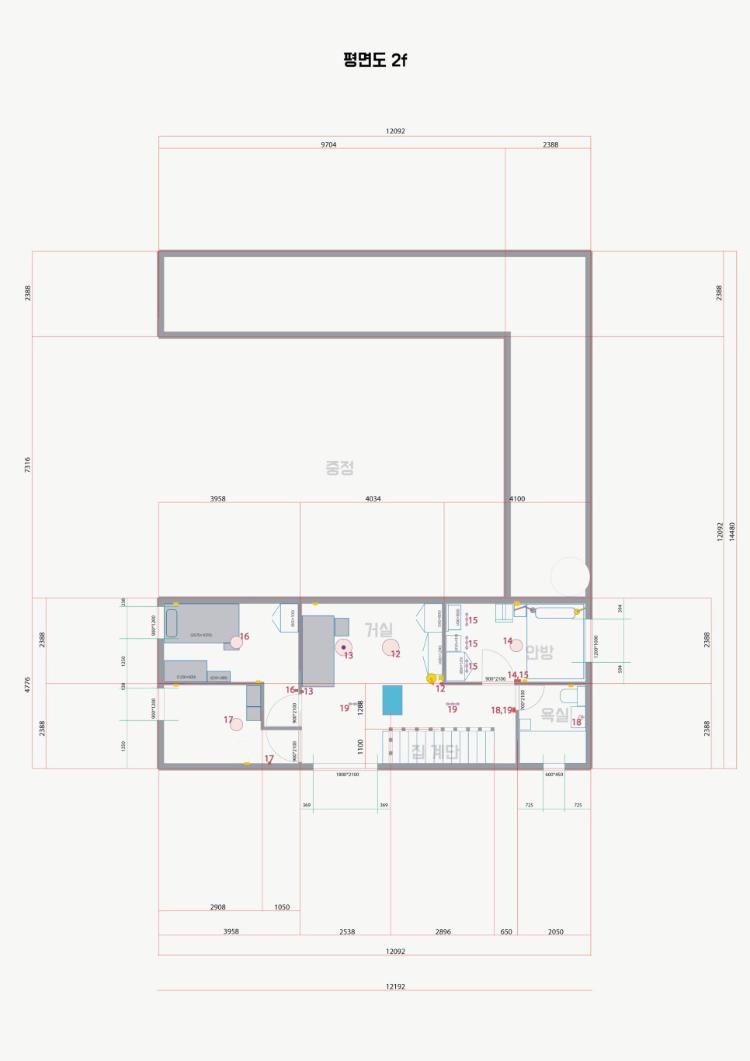 저희는 컨테이너하우스를 셀프로 건축했기 때문에 집 안에 있는 모든 공간을 제가 직접 설계했어요. 일단 컨테이너하우스를 지은 이유는 아이들이 마음껏 뛰놀 수 있고, 부부가 카페처럼 쓸 수 있는 공간이 필요해서 였어요. 제가 일러스트레이터 프로그램을 사용할 줄 알아서 땅 측량 후 건폐율 계산해서 원하는 구조의 도면을 그렸습니다. 저희가 꿈꾸었던 컨테이너하우스는 ㄷ자 형태의 건축물로 건물 사이에 중정을 품고 있는 집이었습니다.