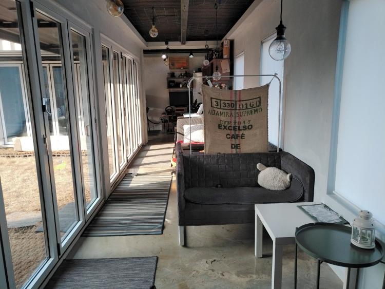 저희 집은 중정을 품고 있는 컨테이너하우스에요.1층 서재 폴딩도어를 전부 열고 중정에 나가서 찍어 본 모습입니다.