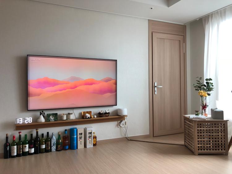 소파에서 반대편의 모습은 이렇게 65인치 티브이와 선반이 달려있어요. 24평 아파트에 좀 클 수도 있겠다 싶었는데, 티브이는 클수록 좋은 것 같아요.